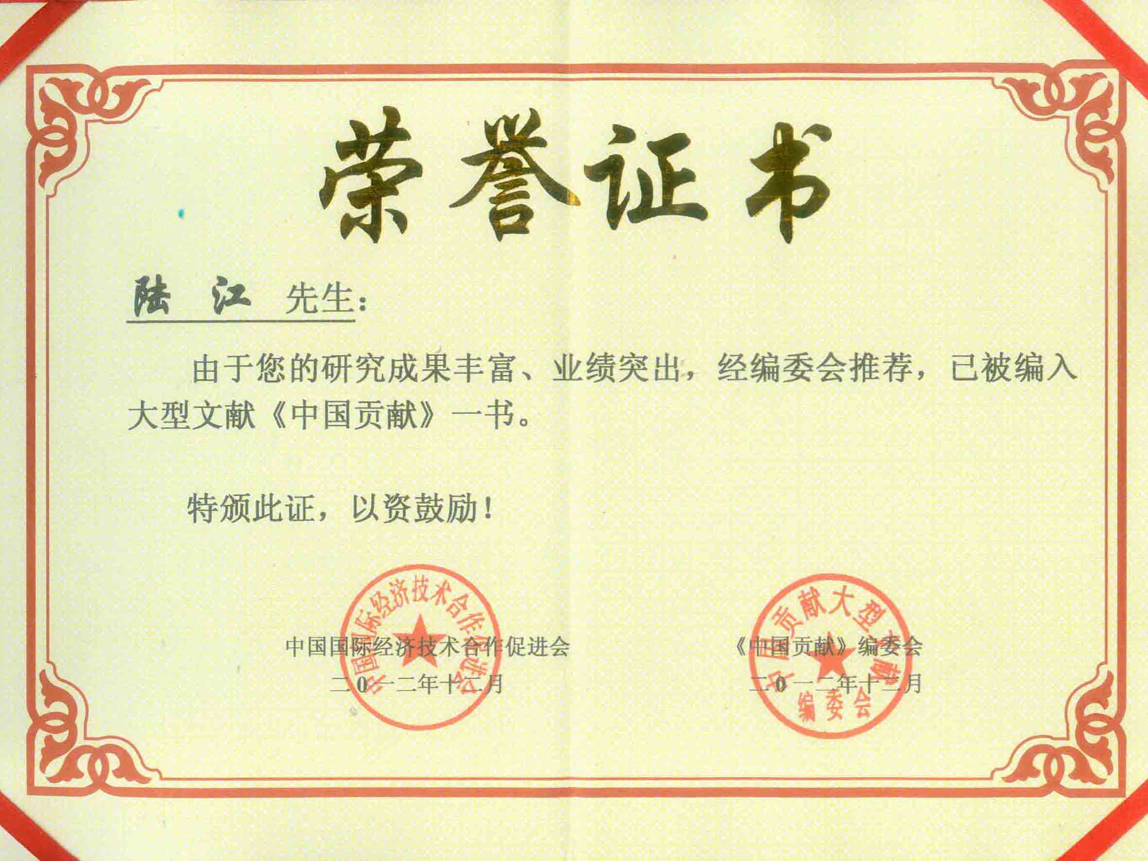 陸江的杰出貢獻被人民日報社評為先進個人